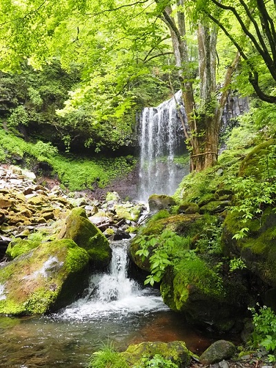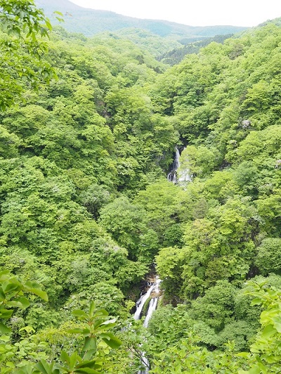 霧降を代表する滝で、駐車場から石畳の歩道を15分程歩いた所にある観瀑台から安心して見ることができます。江戸時代の浮世絵師、葛飾北斎が描いたことでも有名です。樹木の葉で全体が見えなくなっていますが、上下2段に分かれています。