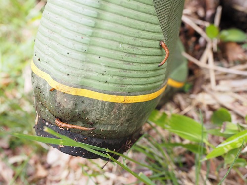 攻撃と言っても、吸血されるだけなのですが、見た目と動きが気持ち悪いので、靴に付いているのを発見するだけで精神的にダメージを負います(筆者主観)。私は今までヤマビルと無縁の人生だったため、この巡視で初めて自分の足にヤマビルが登ってきているのを見たときはゾッとしました。