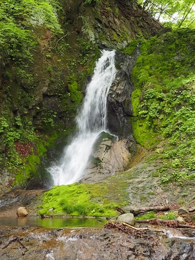 丁字滝から10分程歩くと着きますが、滝の目の前まで行くには濡れた岩の上を歩かなければならず、大変転びやすい場所になっています。水場は落ち着かず、私は滑って岩に尻を打ちました。