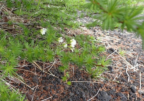 御殿場口新五合目から二ッ塚までの間に植物は少ないですが、フジハタザオがカラマツの下でひっそりと咲いているのを発見しました。その他にも数は少ないですが、シロバナヘビイチゴやオンタデ、ヤマシャクヤクの花が咲いていました。フジアザミも大きく葉を広げている最中でした。こちらも開花が楽しみです。