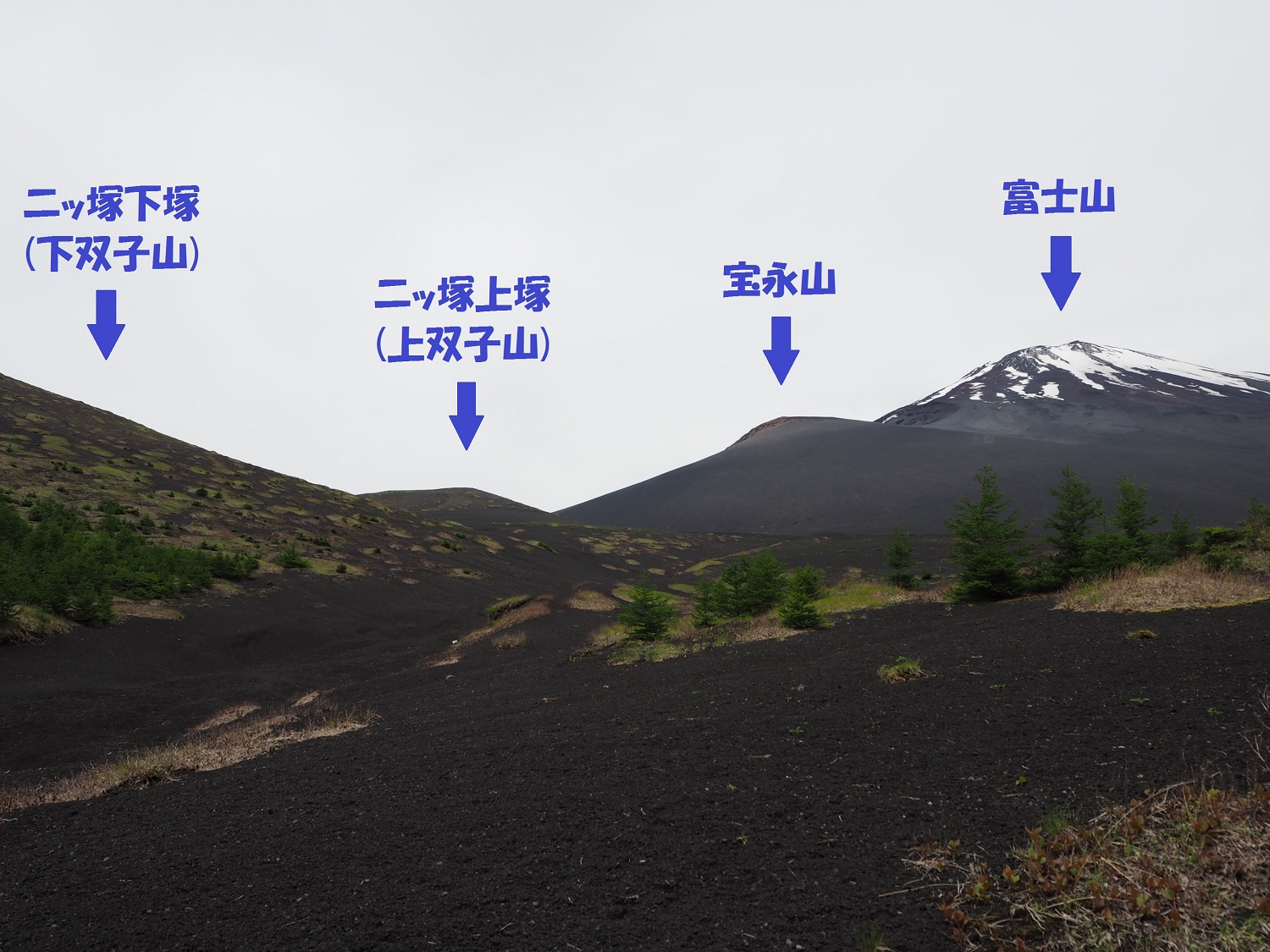 まずは、御殿場口新五合目から1時間程で行ける二ッ塚(双子山)です。名前の通り二ッ塚上塚(上双子山)と、二ッ塚下塚(下双子山)を合わせて二ッ塚(双子山)と呼ばれています。御殿場口新五合目から二ッ塚までは、富士山を正面に眺めながら、これぞ富士山と思わせる砂礫(細かなスコリア)の上を登っていきます。所々砂礫に足を取られ、一歩登っては後ろに戻されるような場所があり、御殿場ルートで富士登山をしようと思っている方には登山道をイメージしやすい場所になっています。
