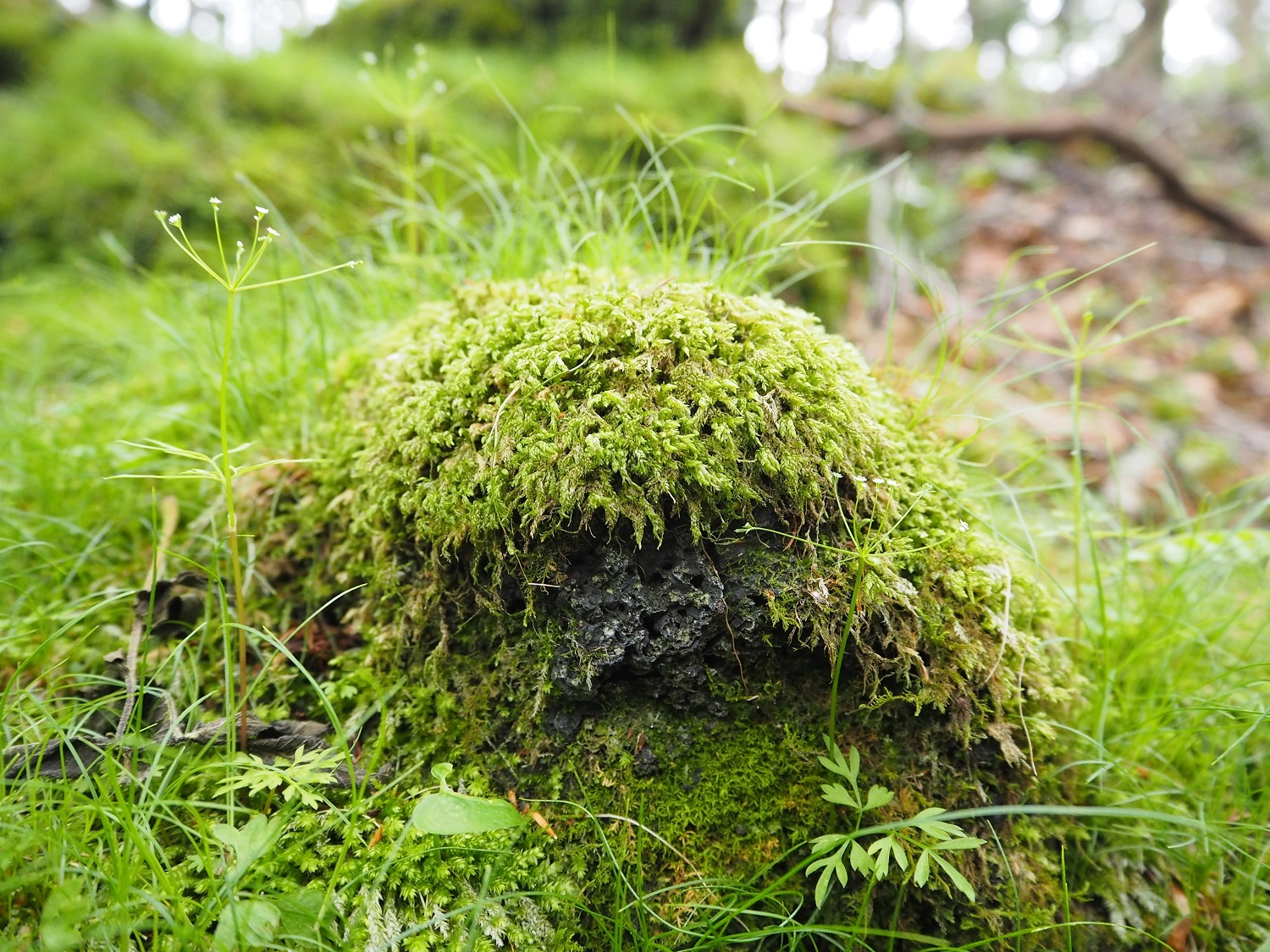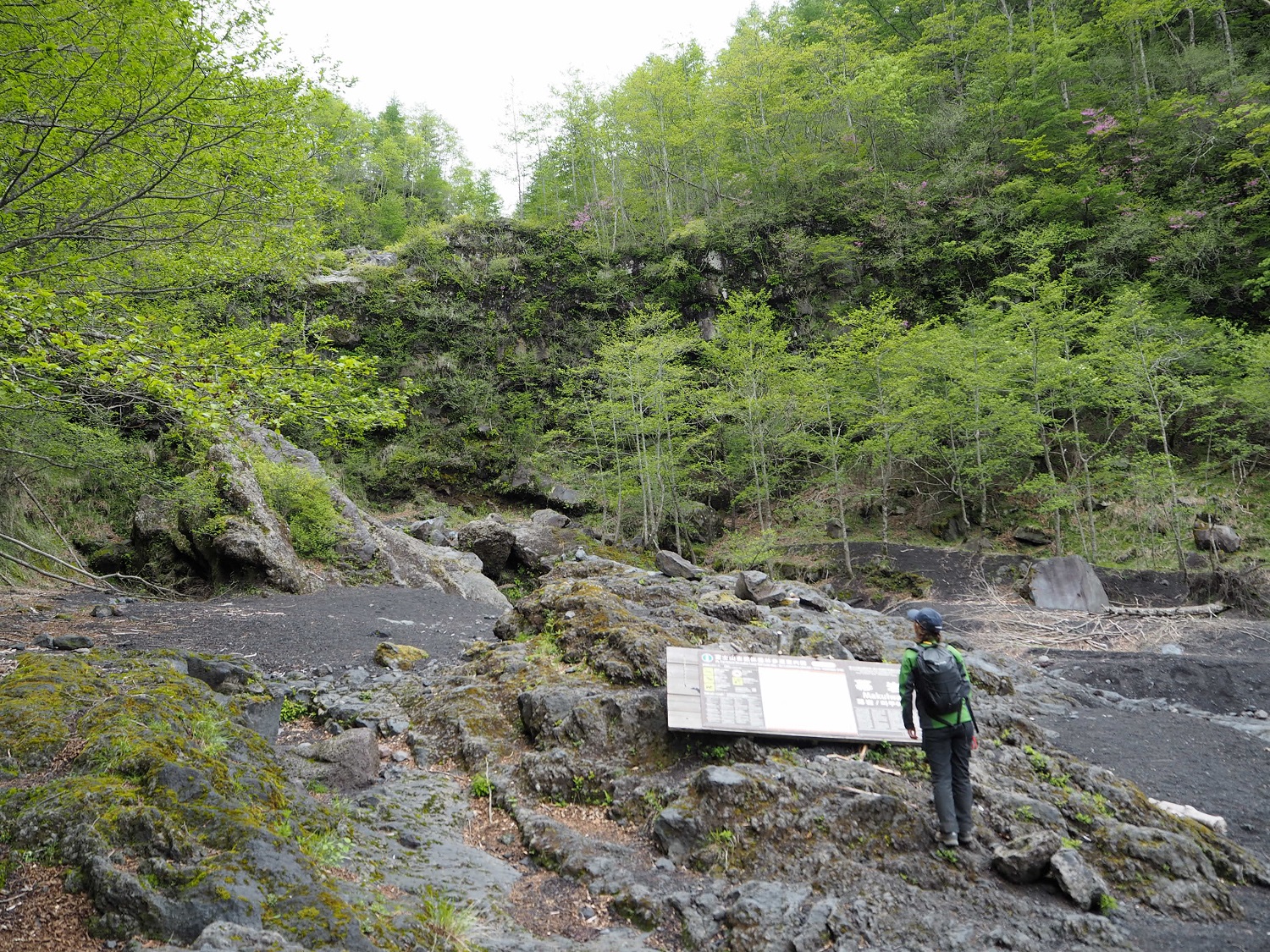 案内看板の奥に見えている岩の壁は全て溶岩で出来ています。最下部は約一万年前の噴火の時のもので、最上部は1707年に宝永山が噴火した時のスコリアだと言われています。この辺りは二ッ塚周辺とは違い植物が生い茂り美しい森ですが、足下はやはりスコリアで覆われています。足を止めて歩道脇に目を向けると細かい穴の空いたスコリアに植物が根を張っています。