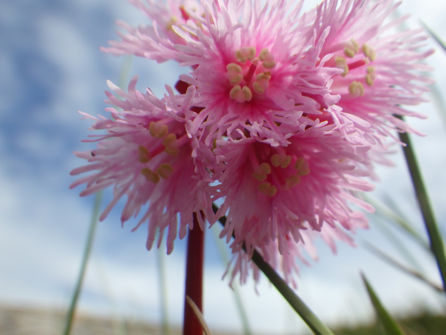 これはお分かりですね、有名な食虫植物のモウセンゴケ(モウセンゴケ科)です。尾瀬のような、酸性で貧栄養の湿原のミズゴケ群落の中に生育します。葉は円形で表面に赤褐色の腺毛が生え、粘液を出して小型の昆虫類を捕まえ、栄養としています。尾瀬のように栄養の少ない場所で生き残っていくための工夫だと思いますが、群生しているモウセンゴケを見ていると、栄養源となる昆虫類が少ないような気がして、少し心配になります。これ以外に本州では尾瀬だけに生育している葉の長さが4~5㎝もあるナガバノモウセンゴケがありますが、注意していなかったので見落としていたのかもしれません。