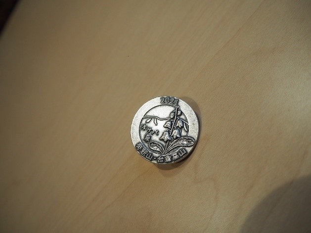 黄色円内がオサバグサの葉 オサバグサ記念ピンバッチ