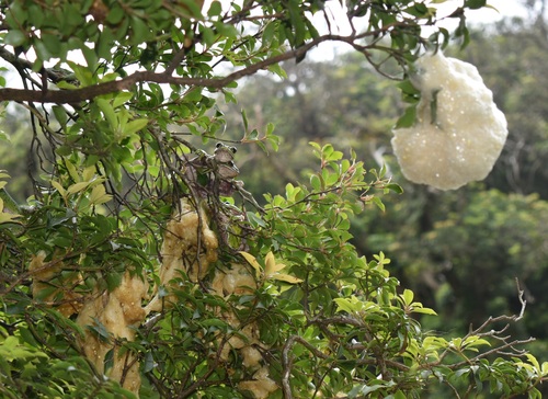 【 中央:モリアオガエルの産卵 右側:卵塊 】(クリック拡大)