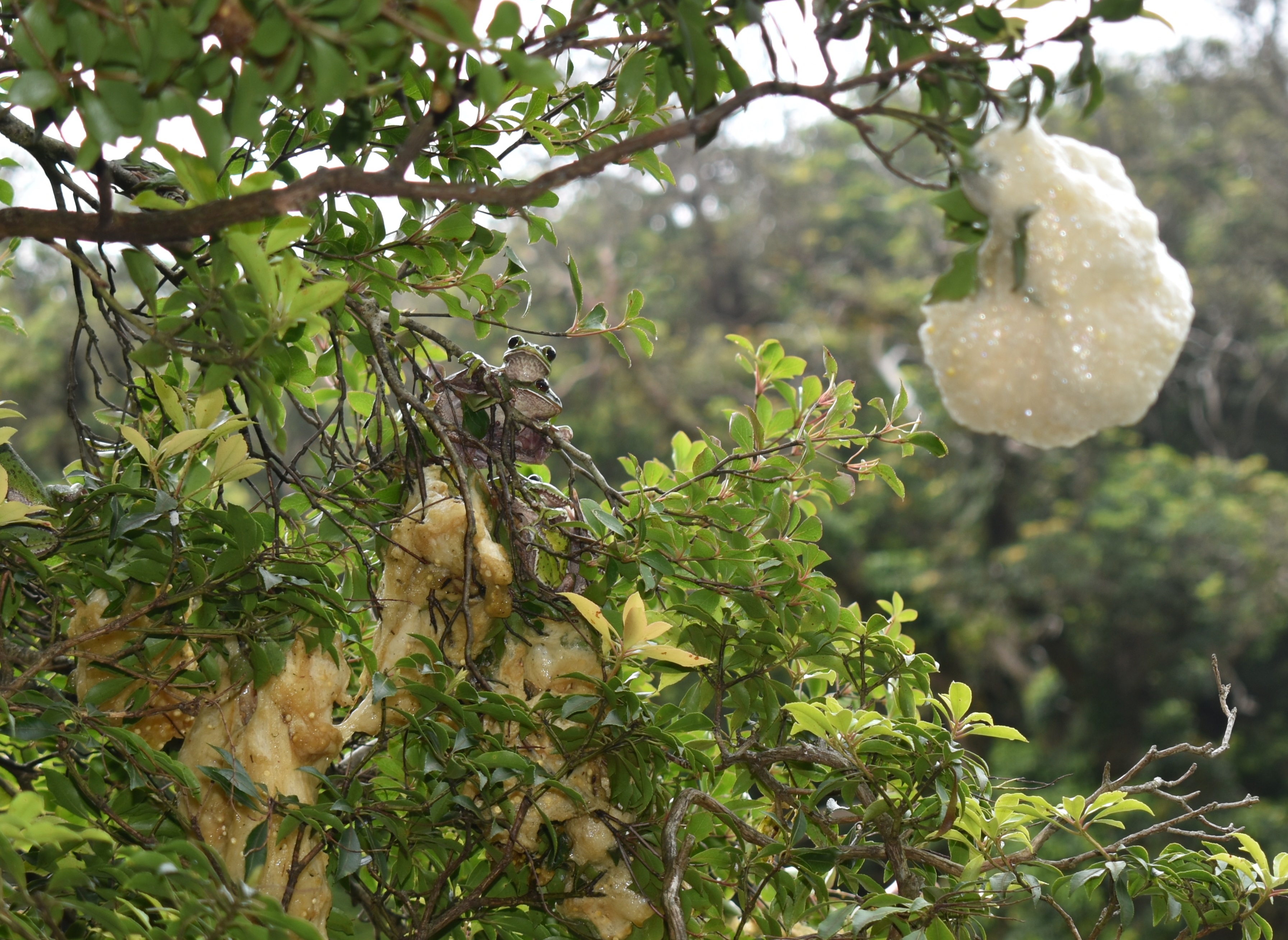 多くの卵塊とモリアオガエルを確認しましたので、写真で紹介します。
