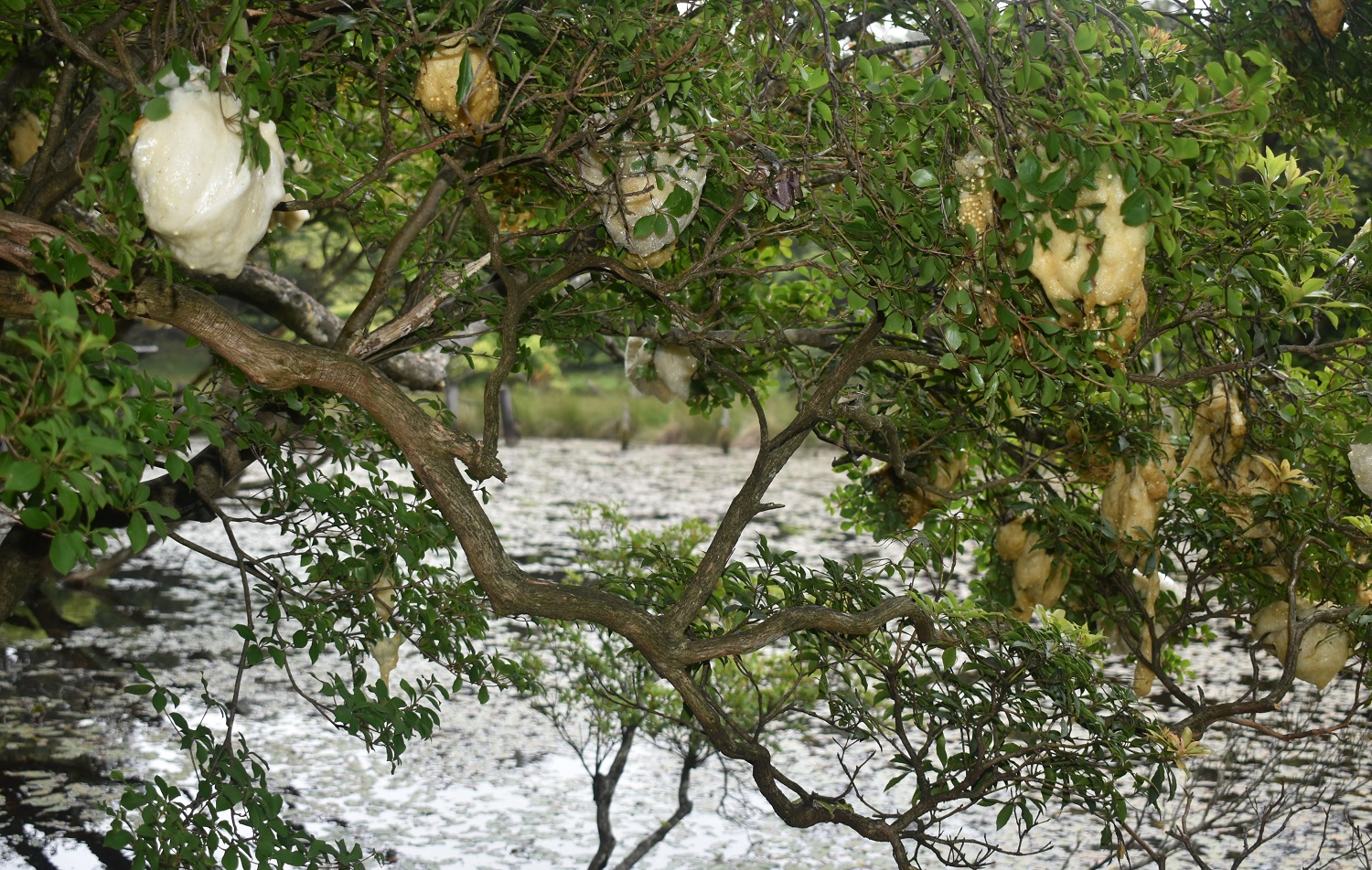 池の周りの木にはたくさんの卵塊を確認できました。人気のある木は枝が池にせり出している木です。卵塊の中で孵化したオタマジャクシが安全に池に落下できるように考えて選んでいるのでしょうか。