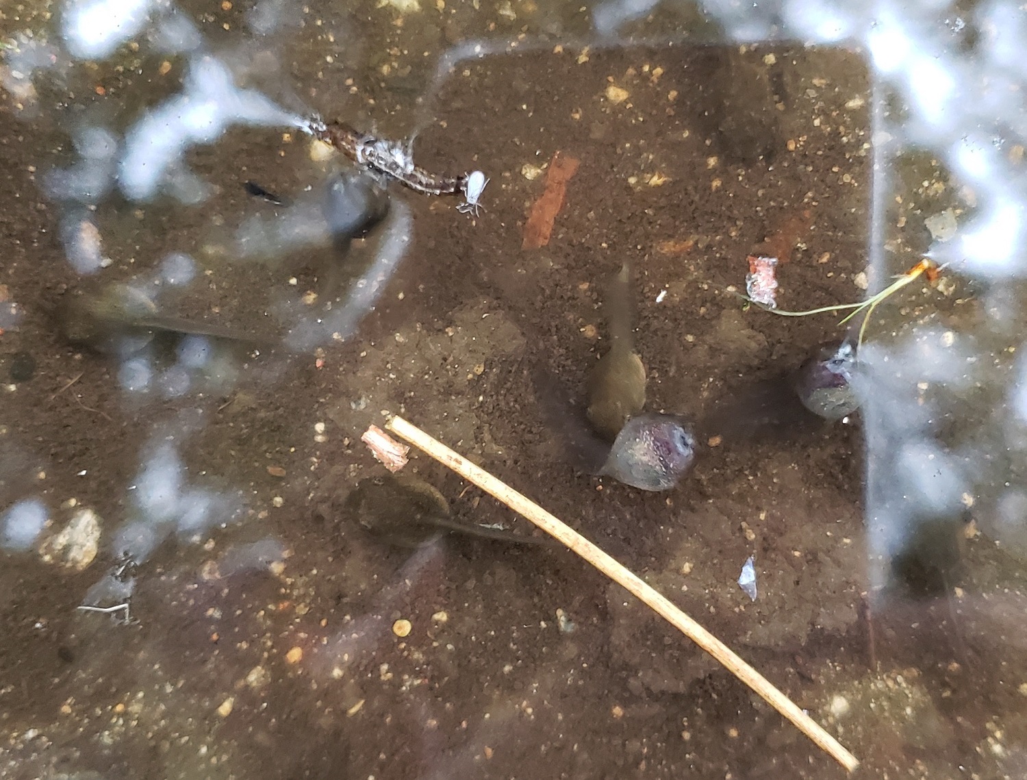 たくさんのオタマジャクシも池の中で確認できました。水面に落下したオタマジャクシは1ヶ月程でカエルの姿に成長し森へ帰っていきます。