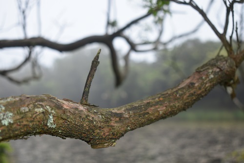 猫越岳山頂の池は伊豆山稜線歩道の仁科峠駐車場から天城峠方面に1時間程歩いたところにあります。モリアオガエルの産卵場所として有名で、普段は森に住むモリアオガエルも、産卵の時期はこの池へやってきます。森の中ではなかなか見る事が出来ませんが、梅雨のこの時期運が良ければ目の前で産卵の様子などが観察できるのです。木の下でしばらく目を凝らして眺めていると、今にもジャンプしそうなポーズのモリアオガエルを発見しました。