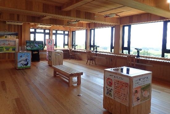 たいてい私が案内を担当するのは「トキのテラス」という施設で、野生トキの観察とトキが生息する佐渡の里地の展望ができます。昨年6月に全面オープンしたこの施設の屋内観察室にはトキの生態に関する展示物があり、また、野外のトキを観察できるように望遠鏡が備え付けられています。ここでトキについて説明したり、トキと佐渡の農業とのつながりを説明したりしています。