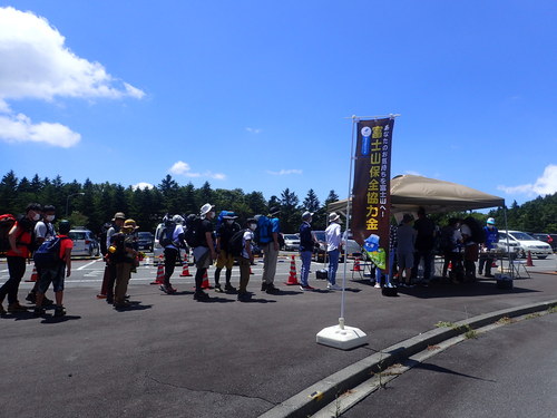 ▲水ヶ塚駐車場の様子 皆様検温と協力金に並んでいます ▲登山者様子 富士宮口八合目付近