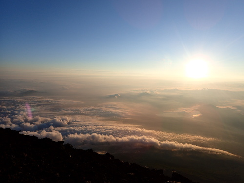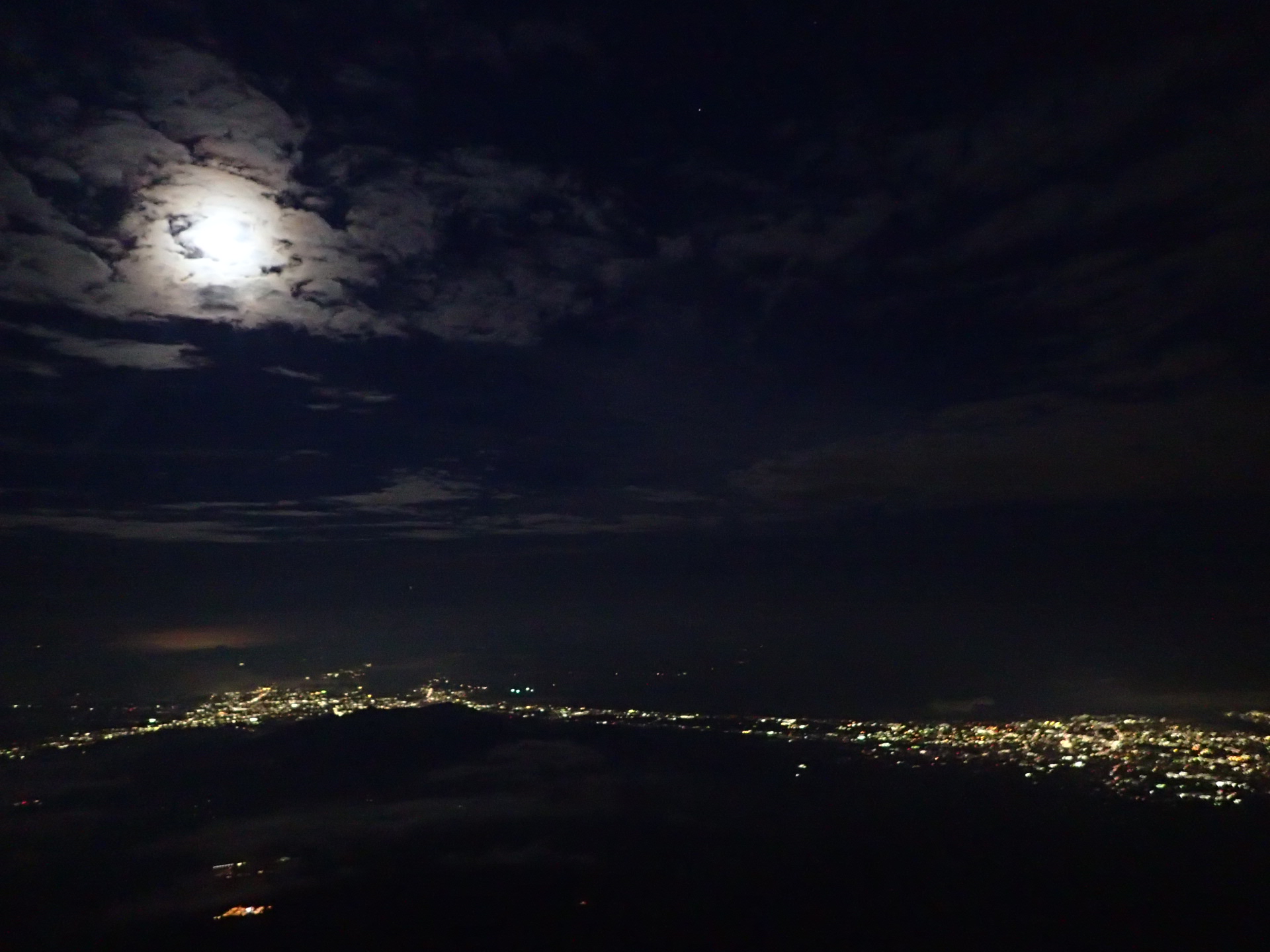 22日、23日のお天気は良く八合目からは沈んでいく夕日がきれいに見えました。満月が近かったこともあり、夜は町の夜景と満月がきれいに見え、日帰りの登山では味わうことのできない富士山をゆっくりと楽しむことができました。