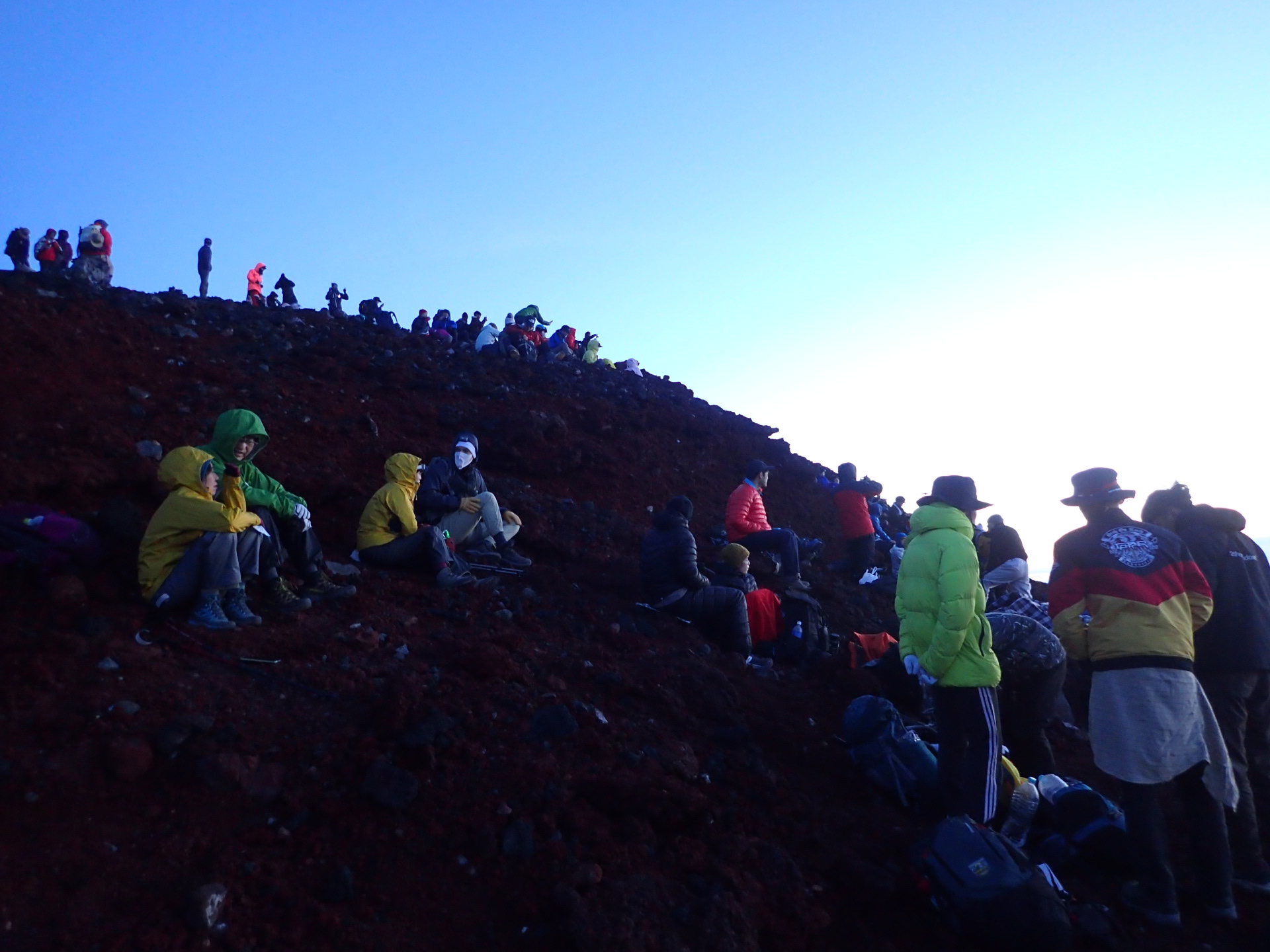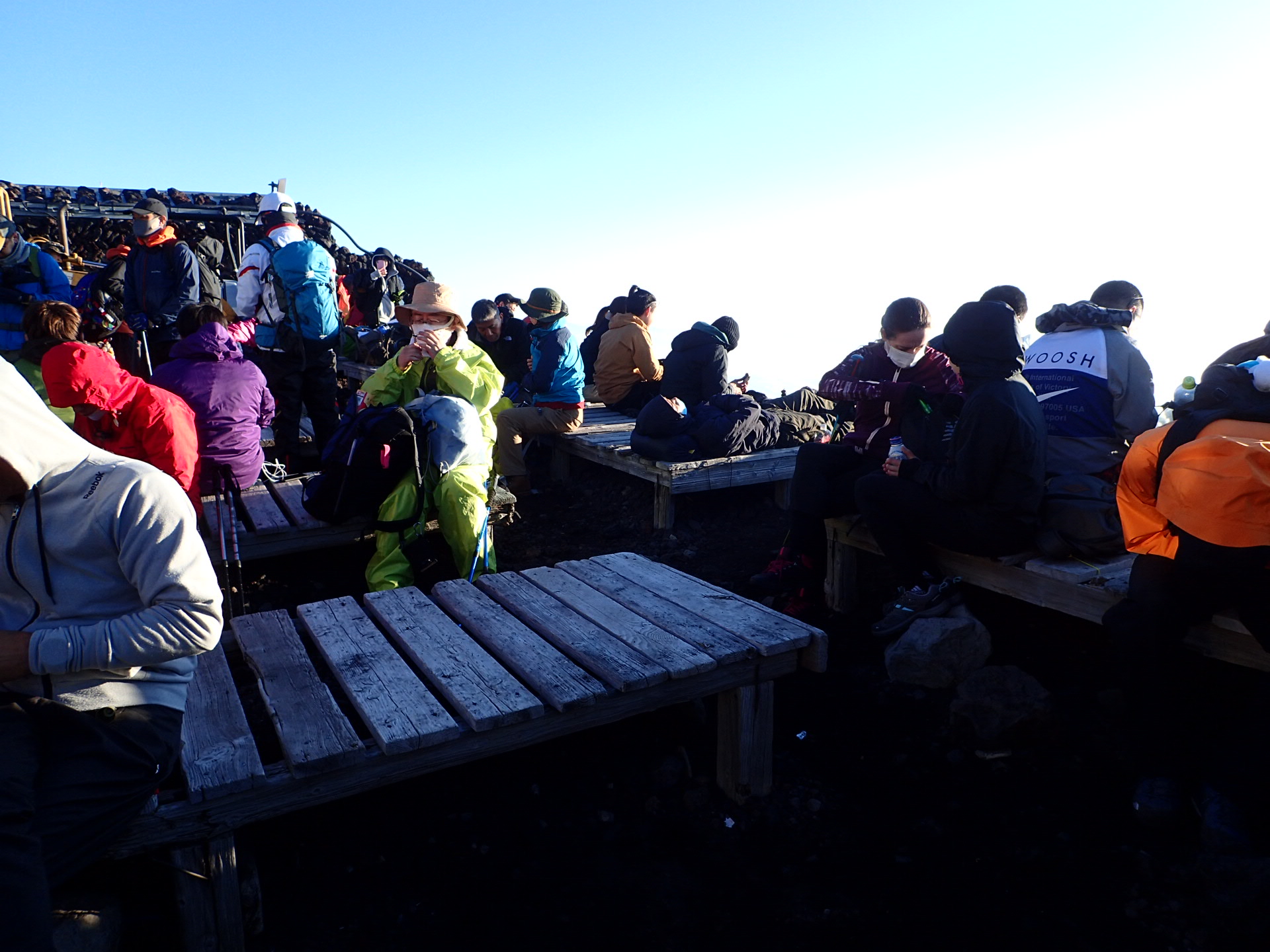 ご来光後の山頂はかなりの人でした。剣ヶ峰には日本最高峰への登頂を待つ人の列ができていました。