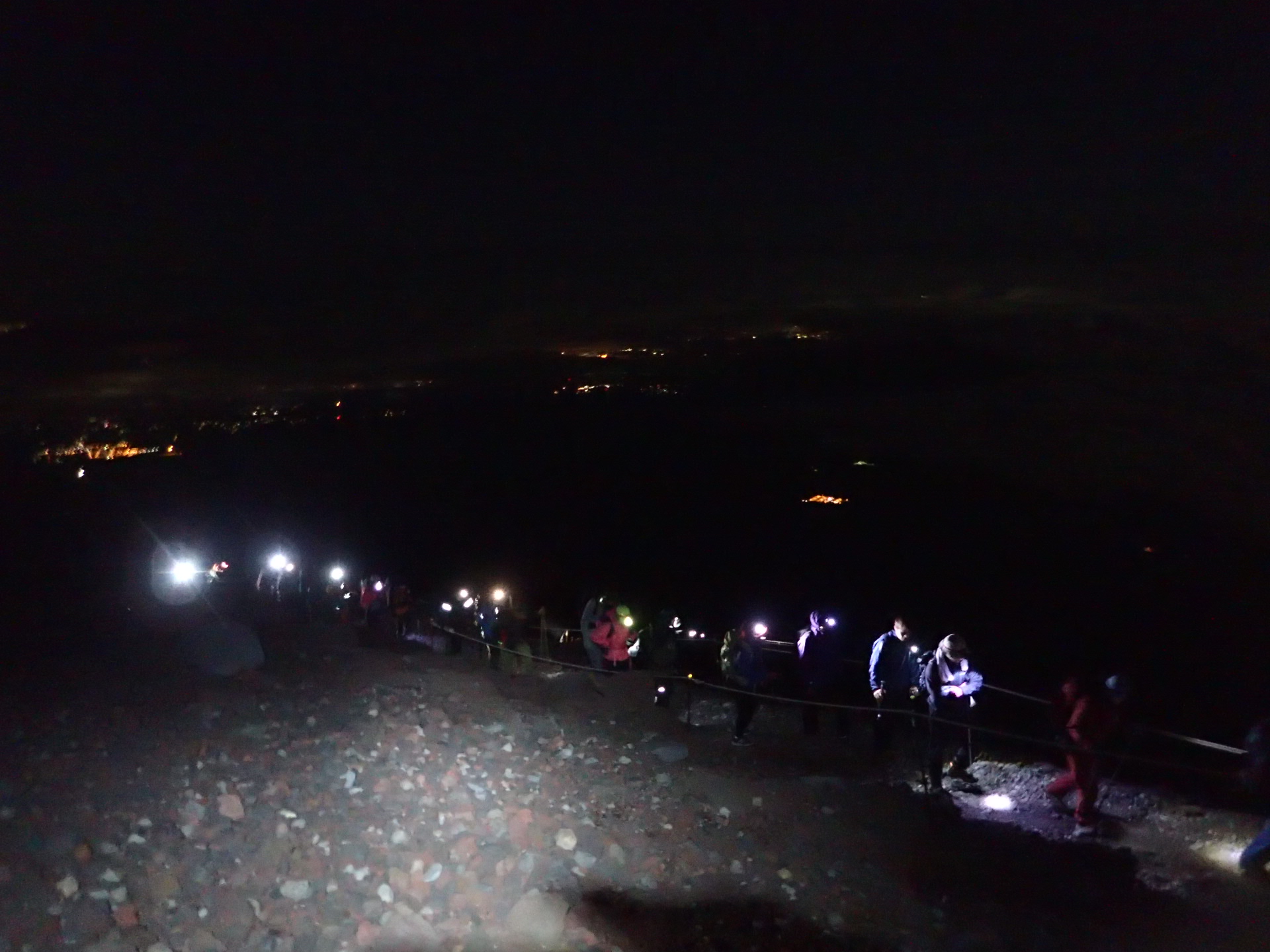 翌朝は山頂でご来光を見る登山者は1時半頃に富士宮口八合目を出発していました。私たちもご来光時の山頂の様子を見るために、1時半に八合目を出発しました。 ヘッドライトをつけながら、ご来光を見るために上がる登山者の方々もそれなりにいらっしゃいました。
