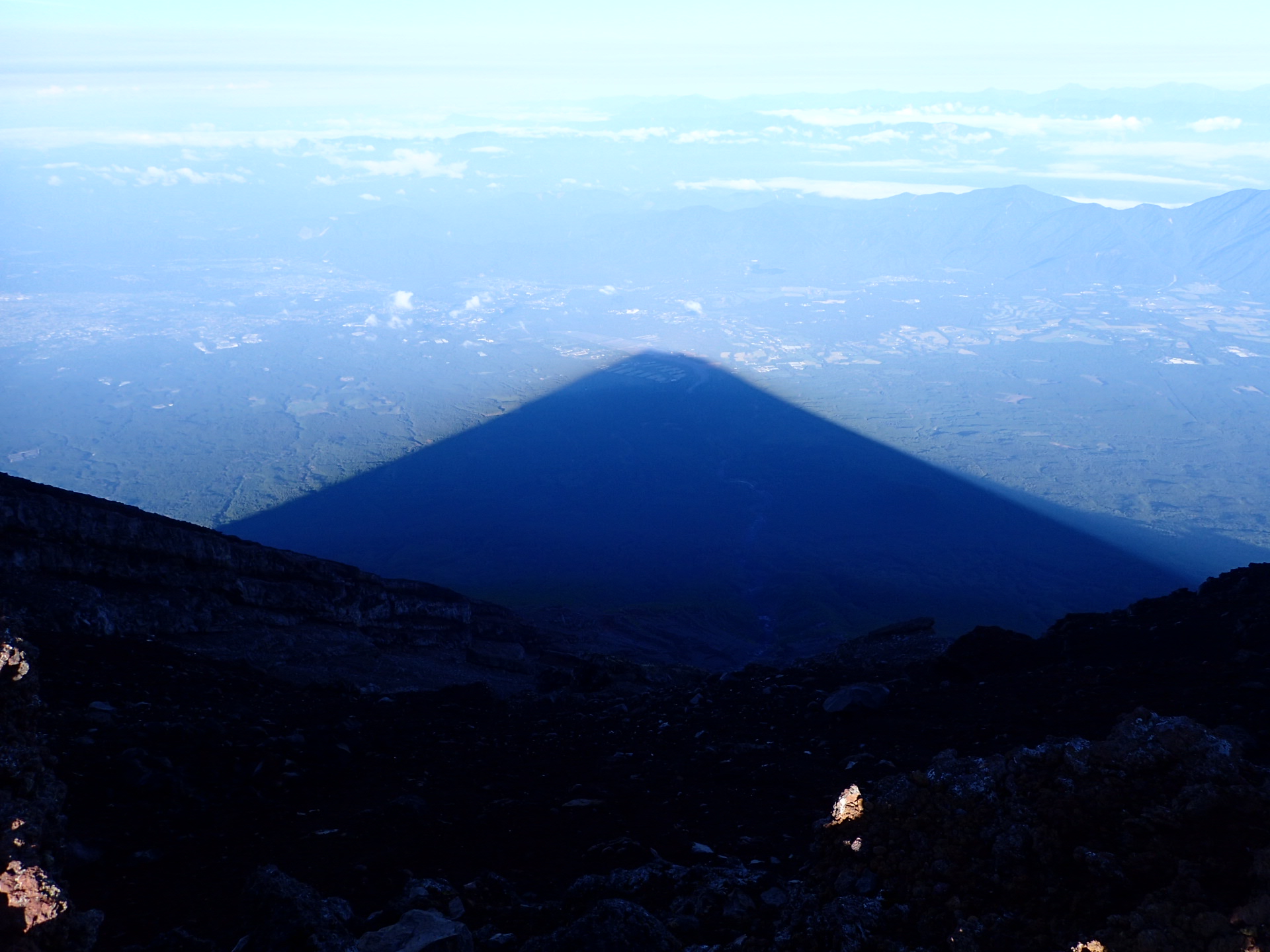 お鉢めぐり中に影富士を見ることができました。富士山に登ると富士山は見られませんが、影富士がみられるのは富士山に登った人だけですね! 調べたところ影富士は、五合目より上、日の出から数時間の間と日没前の数時間の間に出現するそうです。