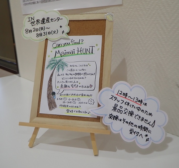 遺産センター内に隠れたマイマイを見つけていただいた方にはなんと豪華景品が!