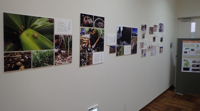 日本で初めて実施したマイマイの野生復帰についての紹介や本物の殻を使っているマイマイの模型など