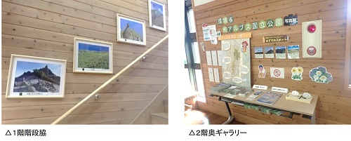 1階階段には展示されている写真の中でもイチオシの9枚が展示されています。2階奥のギャラリーでは写真のほかに南アルプス国立公園でくらす生きもの・地質・文化・ニホンジカ問題についての展示も行っています。南アルプス国立公園や南アルプスユネスコエコパークに関するパンフレットの配布も行っています。バス・乗合タクシーの待ち時間などにぜひお立ち寄りください♪