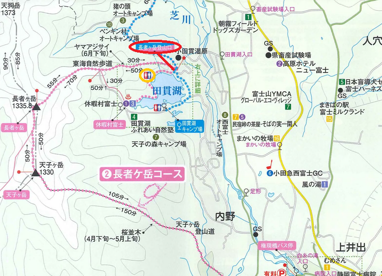 ▲ 長者ヶ岳の地図(富士宮市HPより) 赤丸は登山口、黄色丸が田貫湖バンガローサイト駐車場