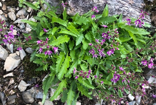 アクティブ・レンジャーの内定をいただいたとき、高山植物に全く興味が無かった私はとりあえず、高山植物の本を買い、南アルプスで見られる花を抽出する作業をしていました。(数が多すぎて着任から5年経った今も終わっていません)そのときの本に¨ミヤマクワガタ¨の文字を見つけ、「虫じゃん」と思っていました。5年経って、ようやく会えました。ミヤマクワガタ。全く虫らしさはなく、むしろ可愛らしいお花でした。オシベ2本とメシベが花の中心から飛び出ていて横向きに咲き、形が特徴的です。また来年も会えるといいなぁ、と思っています。