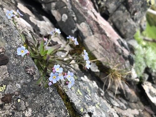 小さく青い花。初対面は「かっわいい~!」から始まり、今では「今年も元気かな?」と久しぶりに友人に会うような気持ちを抱くようになりました。例年、7月末~8月上旬に見られますが、今年はなんと6月下旬には咲いていたとのこと。積雪量が少なかったため、かなり早い開花になったようです。北岳ではトラバース道で見られます。どんなに頑張っても6~7時間ほど歩かないと見られない場所に咲いていますが、頑張った先にはかわいいこの子が待っているので、来年はこの子を目指して頑張っていただきたいです!