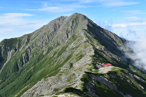 すっきり晴れました~!!赤い屋根の北岳山荘もばっちり見えますね。2時間前は北岳が半分しか見えませんでしたが、2時間後は甲斐駒ヶ岳も仙丈ヶ岳も富士山もしっかり見えました。山の天気は変わりやすいと言われますが、今回は良い方に変わってくれました。