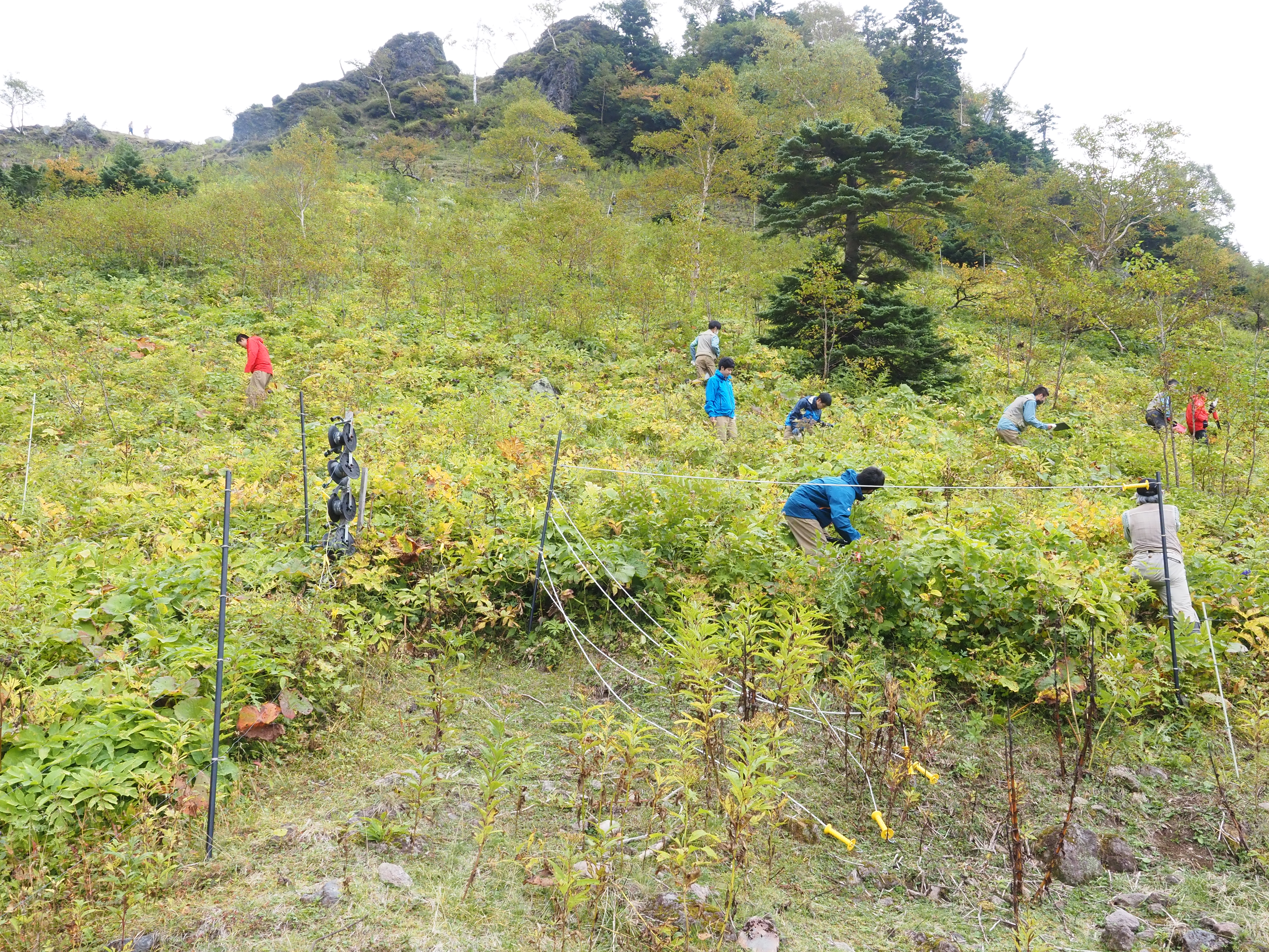 保護地点に到着すると、尾瀬高等生徒が中心となり、電気柵内のシラネアオイの種子を探します。
