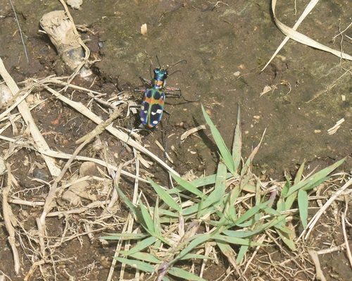 歩道を歩いていると、足下からピヨーンと跳ねる虫がいました。追いかけるとカラフルな体色のハンミョウでした。素早く何メートルも飛ぶので写真に撮るのは諦めようと思いましたが、何枚か撮影出来ました。事務所に戻り写真を確認してみると、なんとピントが合っているのはこの1枚だけでした。素早く動くので難しいです。次回は前方から鋭い牙をカメラに収めたいです。