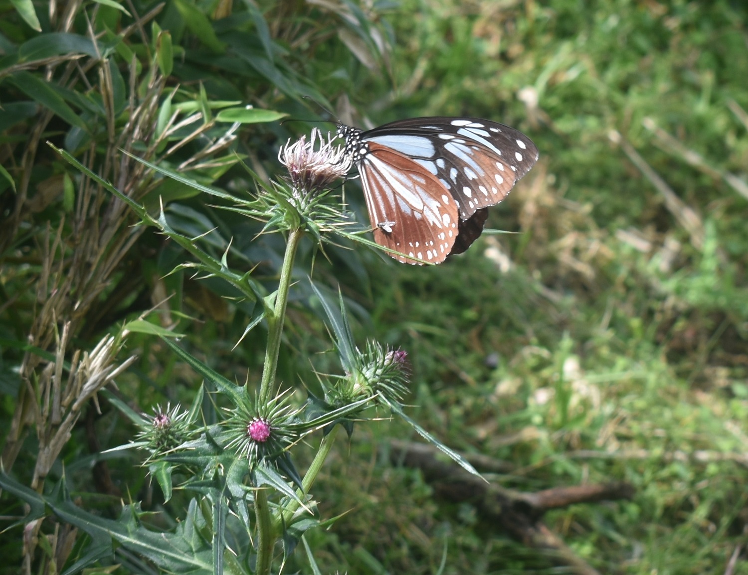 次はアサギマダラです。アザミの蜜を吸っていました。この時期歩道上に花が少なく、ふとアザミの花に目を向けるとアサギマダラが止まっていました。アサギマダラは非常に長い距離を移動することで有名な旅する蝶と呼ばれていますが、この後はどこに行くのでしょうか?春頃から伊豆半島で何度も見かけていますが、毎回ヒラリと飛んで行ってしまい、今回やっと撮影することが出来ました。