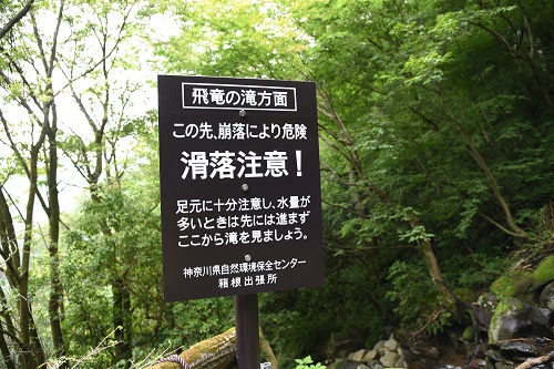 飛龍の滝は起伏が激しい「湯坂路~畑宿」を歩く、飛龍の滝探勝歩道ハイキングコース上に位置します。この景観を眺めに行く場合には、足元は登山用靴がおすすめで、ストックなども持つと良いでしょう。
