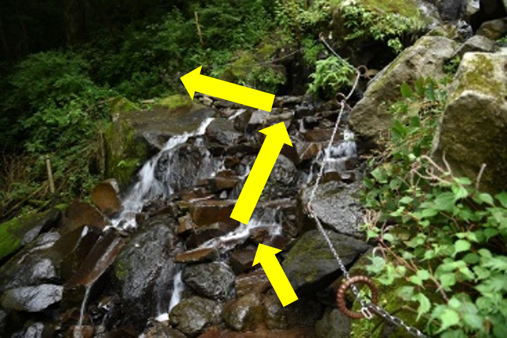 滝の足元に近づくときには、水が流れる場所もあるので、濡れる覚悟で進みましょう。鎖はしっかりと設置してありますが、滑らないように十分注意して、ゆっくり慎重に歩く必要があります。無理はしないで下さい。
