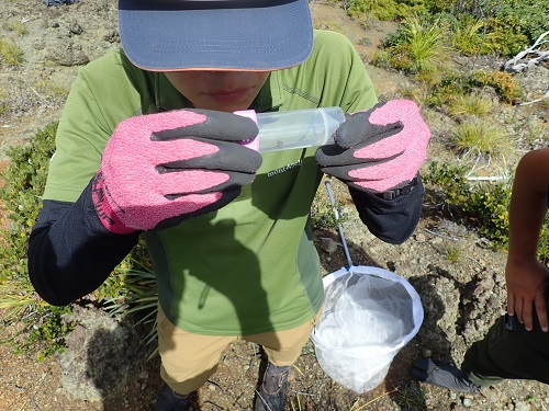 兄島では、大きな網を持って体長1cmほどのオガサワラハンミョウを捕獲していきます。