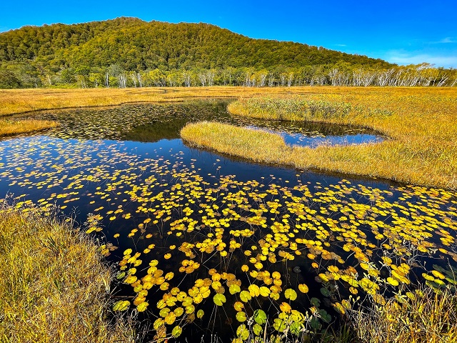 尾瀬は四季折々、自然そのものの姿を見ることができるのが魅力です。季節ごとに様子を変える姿はどれも美しく、何度見ても飽きません。その中でも秋の尾瀬ヶ原は、草紅葉(くさもみじ)が赤や黄金色に色づき、さらに湿原にある池塘(ちとう)に浮かぶヒツジグサも彩りを添えて、夏の尾瀬とはまた違った姿を感じられます。ゆっくりと流れる時間に癒されてみてはいかがでしょうか。