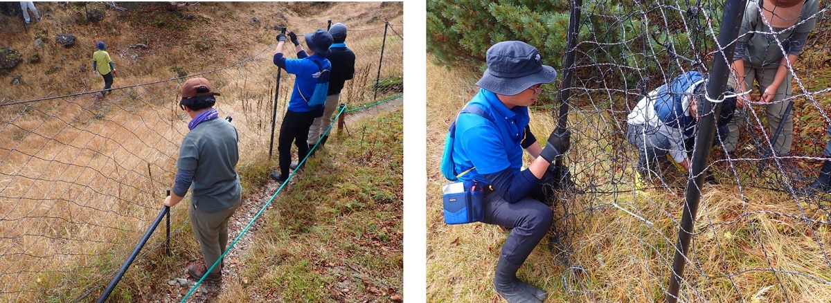 杭の中にポールを差し込み、ニホンジカが噛みちぎれない繊維のネットをポールにかけます。積雪量が多く、設置したまま越冬すると雪圧で杭やポールが曲がってしまうので、初夏に立ち上げ作業、秋に撤去作業を行います。
