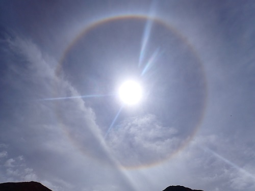 見つけたときは、「珍しい現象かな?綺麗~」と心弾ませていましたが、調べてみるとハロ現象が見られるときは、天気下り坂のサインといわれており、低気圧や前線が接近して天気が崩れる前触れと言われているそう・・。案の定、翌日は強風と雨でしたが、ステキな光景が見られたのでヨシとします!!