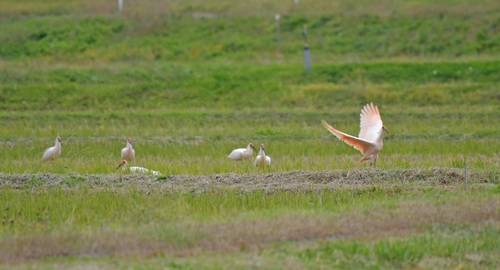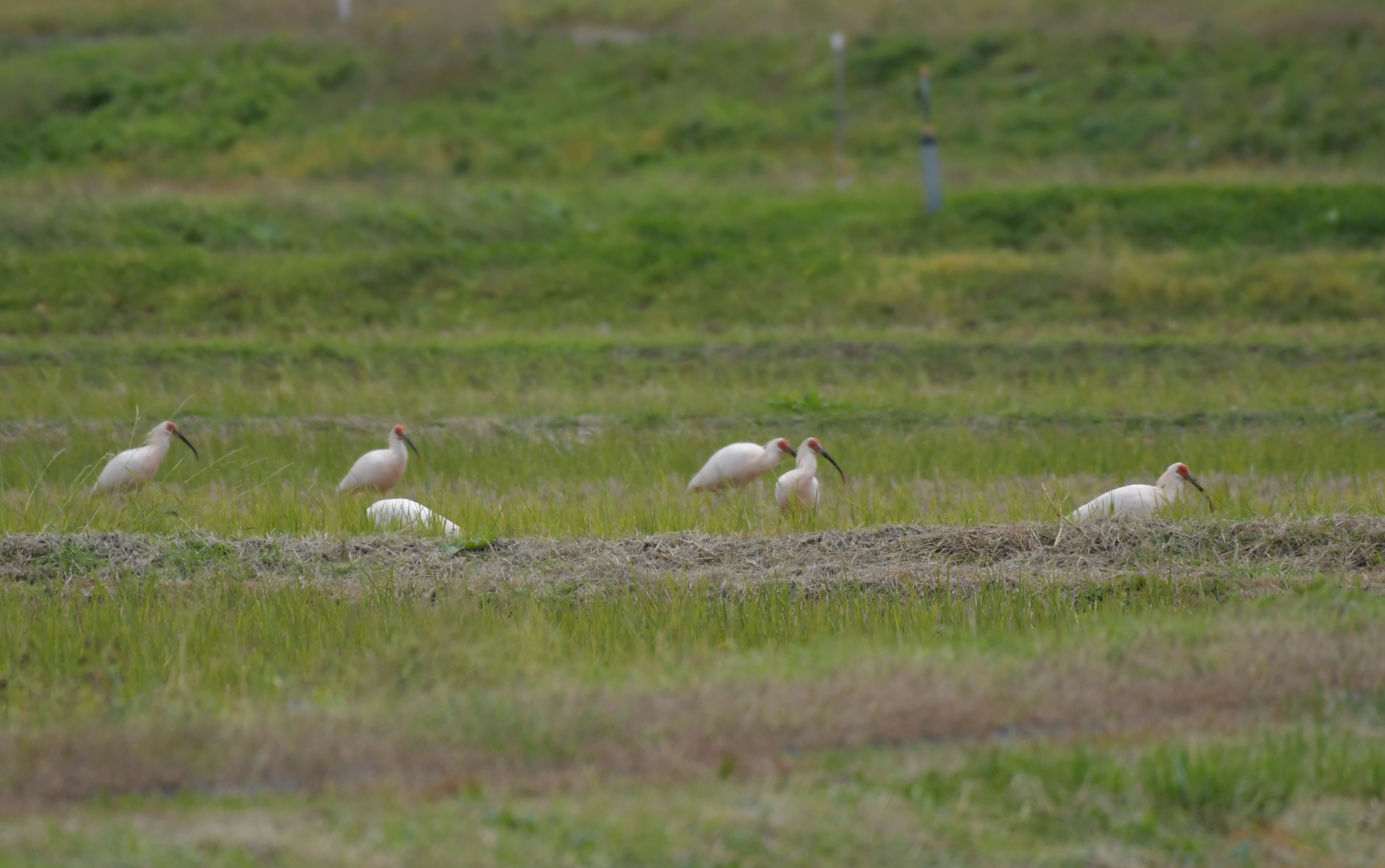 【集団で採餌するトキ】