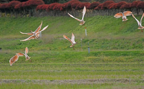 秋から冬にかけてのこの時期、トキたちは集団で行動しています。たくさんのトキが集って餌をついばむ姿はなんとも愛らしく、また複数のトキが飛翔した時に目の前に広がる「とき色」はとても綺麗です。