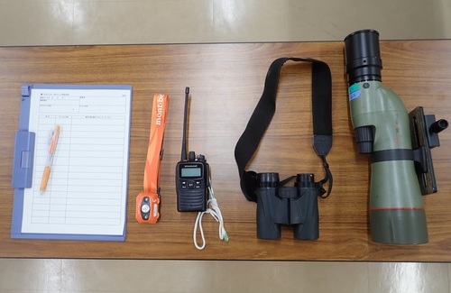 無線機 : 各地の観察者とねぐら出の羽数や方向を共有し連携します。