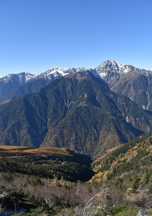 撮影日の夜、向こうの北岳から降雪した雪がこちらまで舞ってきました。この時期の高山はきりっとした寒さがあり、空気が澄み、普段の景色がより一層綺麗に見えるような気がします。3,000メートルあたりは雪、2,000メートルあたりは紅葉。標高の差でこんなに違う景色が見られることも山ならではですよね。秋と冬を一緒に感じることが出来ました。