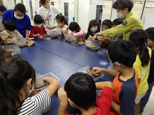 そして3回目の授業では実際に小笠原世界遺産センターで小笠原固有のマイマイに触れながら小笠原のマイマイについて勉強してもらいました。