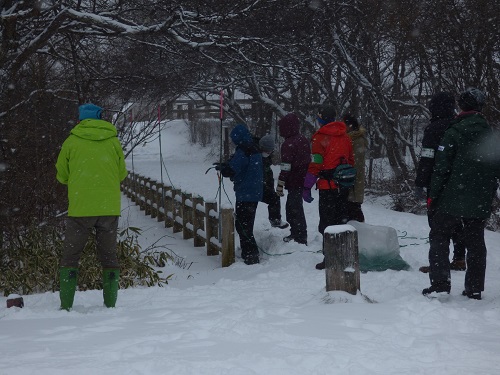 この日の話しは、これから設置する湯元スノーシューコースや戦場ヶ原周辺での冬季活動の注意事項、植生保護のための湿原入り込み防止の標識などの設置、駐車場やトイレの冬期閉鎖情報などで、日光国立公園管理事務所からは歩道の冬期利用の注意事項や管理などをお話しました。
