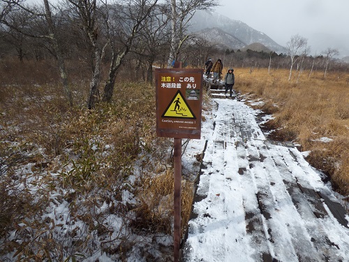 また、凍結した木道や階段に加え、積雪により階段やセパレートに分岐した木道などが不明となりスリップや踏み抜きなどにも注意が必要です。