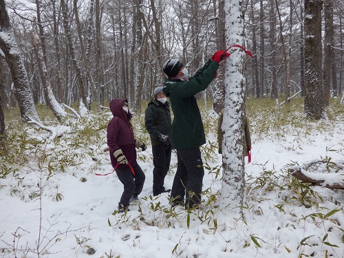 戦場ヶ原歩道等のフィールドでも冬期の準備作業を始めています。冬期はスノーシューやクロスカントリースキーを利用する方が多く、日光パークボランティア(NPV)活動では道迷いや湿原への入り込みなどを防ぐため、歩道のコース沿いに赤布やポールなどの設置や安全のための雪上パトロールを行っています。