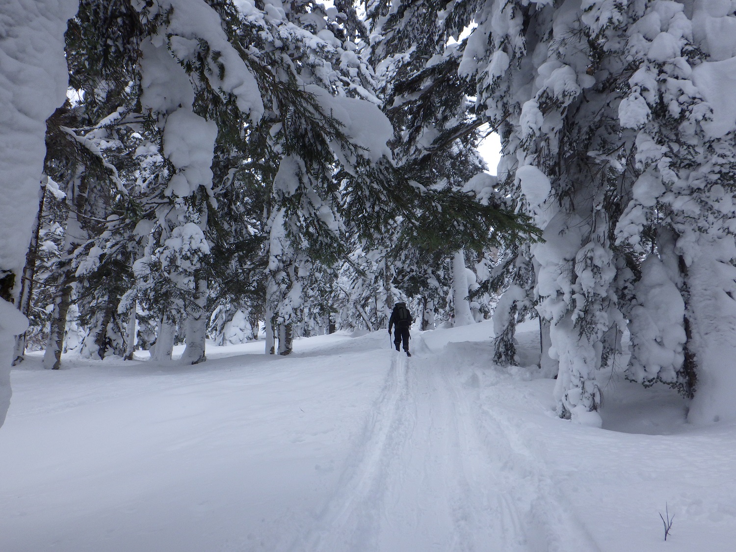 雪上車は約2時間かけて沼山峠に到着しました。ここからは各人スキーに履き替えて沼を目指します。先行したモービルはそのまま沼に向かうことができたようで、峠には残っていませんでした。深雪の中、沼を目指して登り始めましたが、モービルの跡は雪が踏み固められているので、楽に歩くことができました。大江湿原まで降りてくると、モービルが迎えに来てくれたので、沼まで同乗させてもらいました。