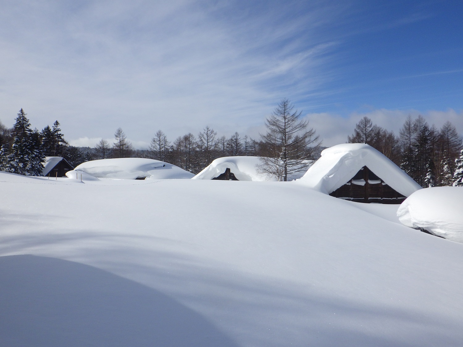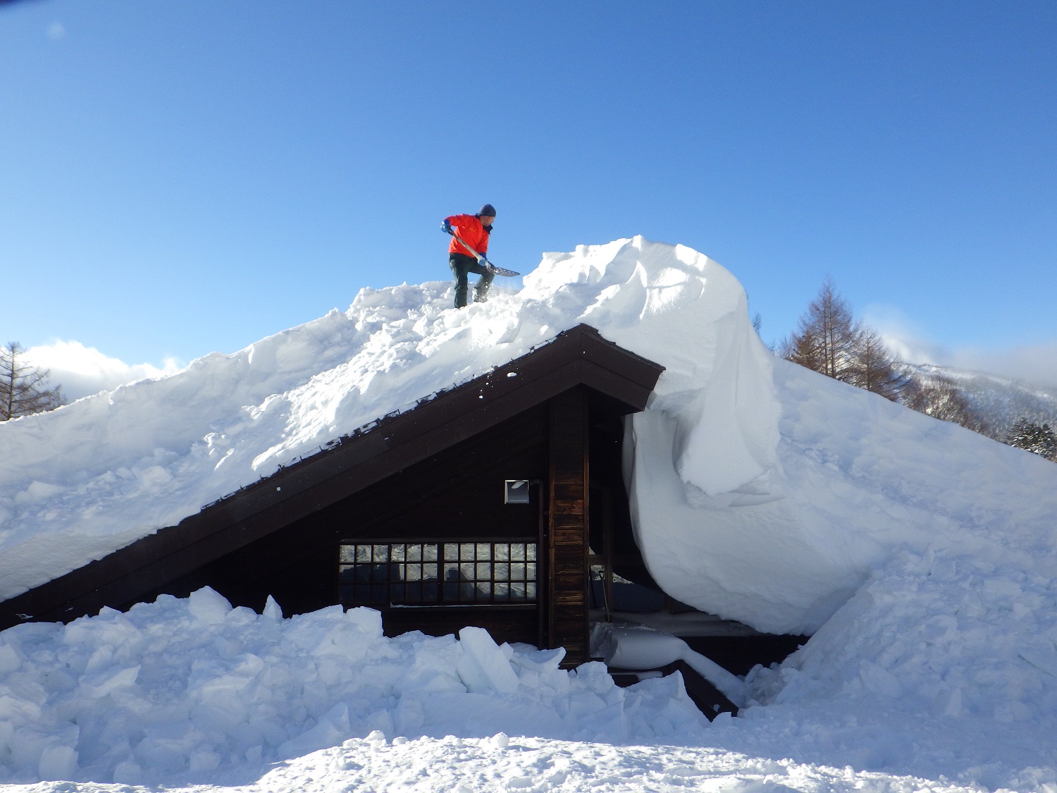 新ビジターセンターと旧ビジターセンターに分かれて、それぞれ屋根の雪下ろしにかかりました。パワーのある村の若い人はスコップやスノーダンプでガンガン雪を落としていきます。私は旧ビジターセンターにまわりましたが、掘っていくと堅くて重い雪の層に当たり、なかなかはかどりません。建物周りは歩くと埋まってしまうような深雪でしたが、除雪機のお陰でいつの間にか立派な道がついており、行き来がだいぶ楽になりました。