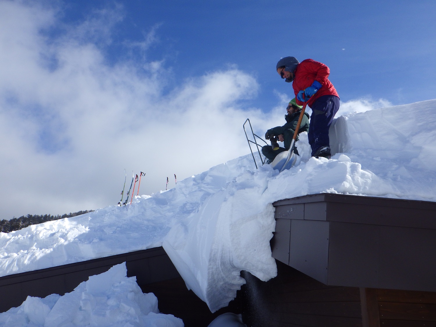 旧ビジターセンターで大変だったのは屋根からぶら下がった雪庇(せっぴ)落としです。最後に残ったものは長さが3mにもなり、スコップではどうにもならないので、スノーソー(ロープに歯を付けたもの)を使って切り落としました。