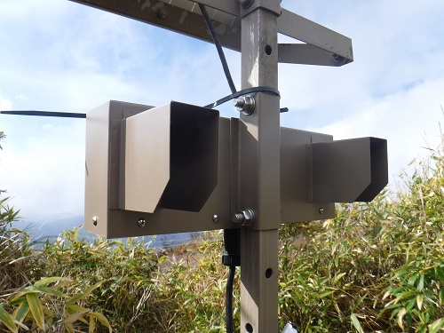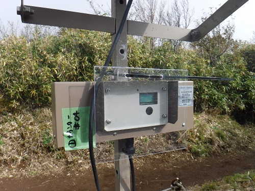 特に、明神ヶ岳は機器の内部に砂粒が侵入するほどの場所もある風衝地ですので、下の写真のようにアクリルパネルで風よけのカバーを付けてみるなど試行錯誤しています。