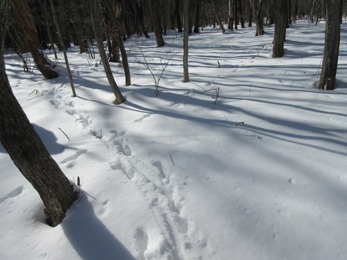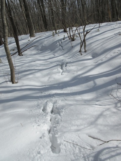 今一番目立つのはシカの痕跡です。雪があるため、動物の活動の跡が良く残ります。