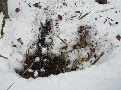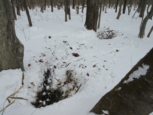 こうした掘った穴の中には、凍り付いていて笹に到達できていないものもあります。