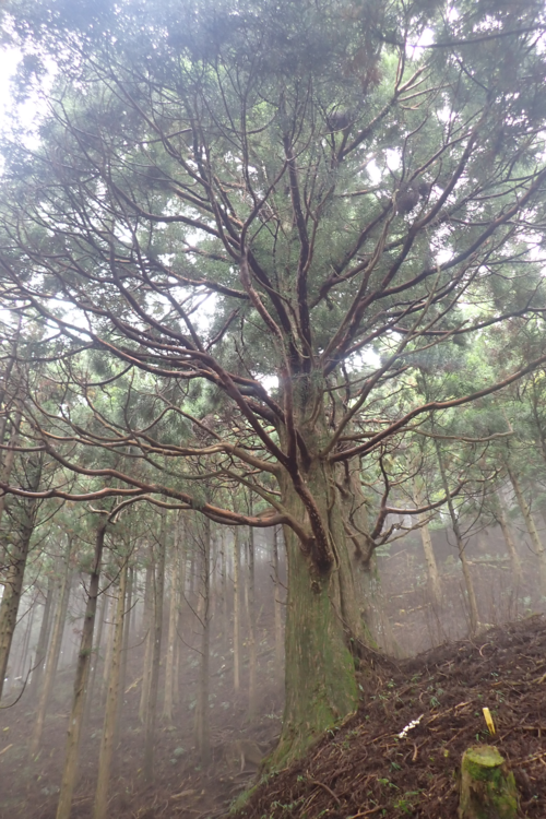 下山は元来た道を戻ることもできますし、自然杉の大木のある黒岳に寄り道して山神社側に下山することもできます。黒岳山頂付近にいくつか残っている樹齢300年~400年程の自然杉の大木は一見の価値ありです。